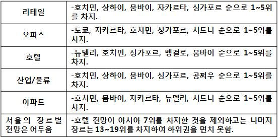 아시아 20개 도시의 2011년 부동산 전망을 전체적으로 정리하였다. 관련된 자료는 ULI가 조사 발표한 자료를 바탕으로 정리하였다.1)